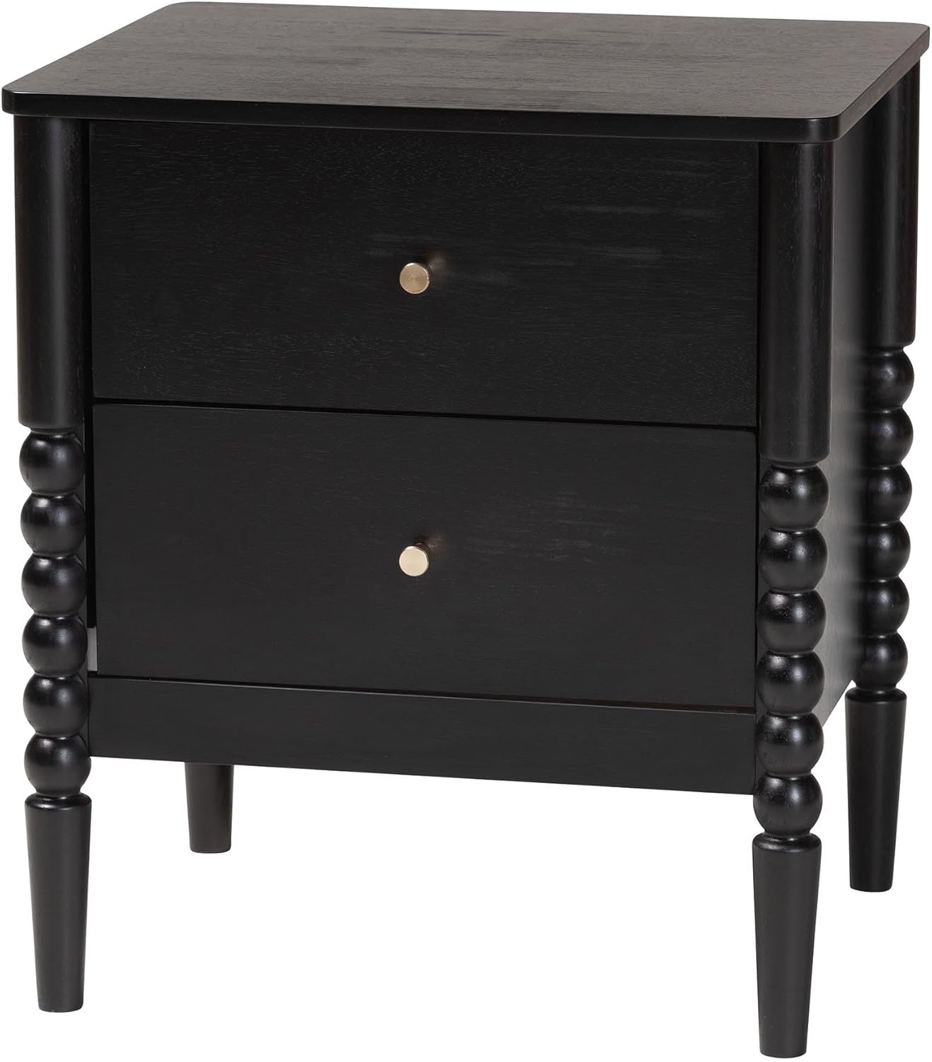 The vintage artistry of the exuberant Lucera nightstand brings traditional flair to your bedroom. Made in Malaysia, this mid-century inspired piece is crafted from sturdy wood. Turned bobbin embellishments envelop the legs for a captivating display rich with classic charm. The Lucera requires assembly and features two drawers to accommodate your bedside essentials while reserving the tabletop for nightly use. Minimalist metal drawer knobs add a touch of glamour, making the Lucera nightstand a marvelous bedroom element.