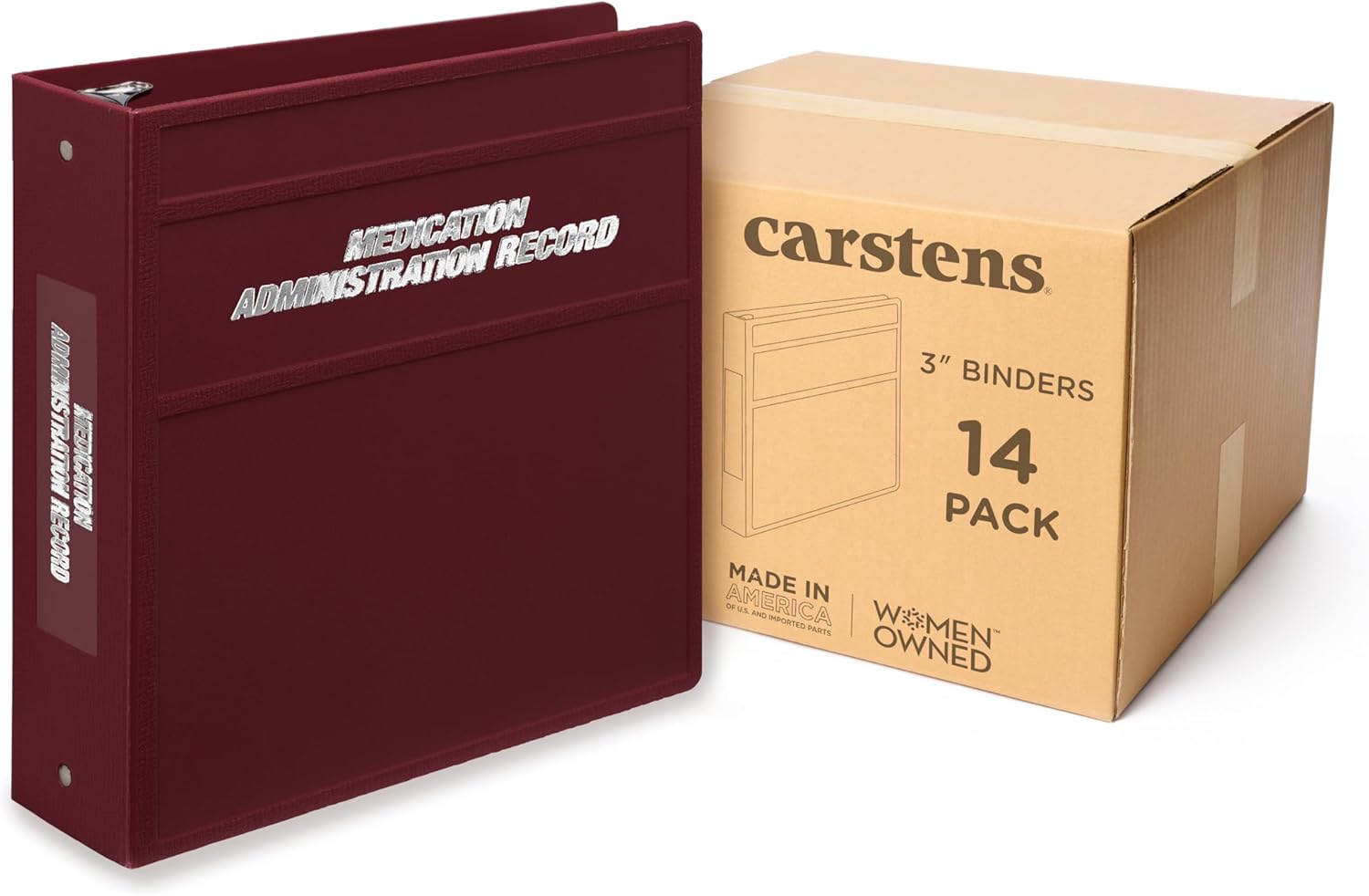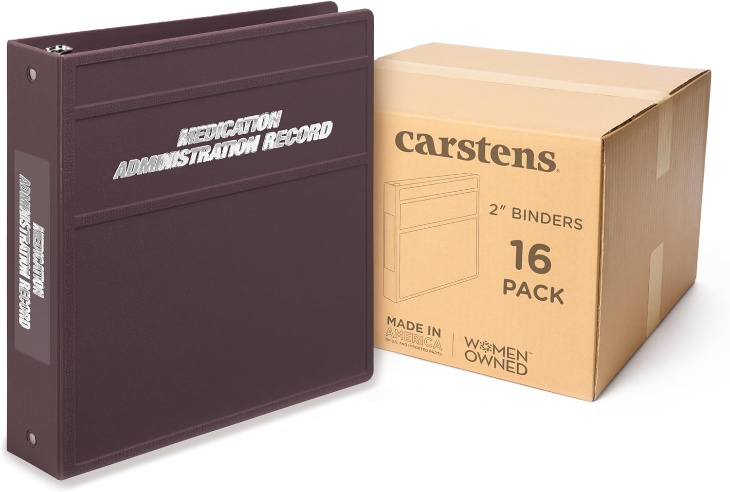The Carstens Medication Administration Record Binder is a premium heavy-duty round ring binder designed to organize and protect essential patient records in high-demand healthcare settings. Made from copolymer polypropylene plastic, this binder resists tearing, bending, and everyday wear—outperforming standard vinyl binders that can absorb liquids and degrade over time. Its non-porous surface allows for easy cleaning, making it ideal for environments where durability and cleanliness are important. This side-opening binder is built for U.S. letter-size paper punched along the 11" edge and features Carstens’ No-Gap steel ring mechanism, tested to withstand over 50,000 uses to ensure consistent performance. The 2-inch round rings securely hold up to 300 sheets, providing ample capacity for Medication Administration forms, care plans, and other critical documentation. The title “Medication Administration Record” is hot-foil stamped in silver directly into the plastic on both the front cover and spine, offering a clear, professional look that won’t peel, fade, or wipe off—unlike traditional sticker labels. Carstens Medication Administration Record Binders are available for purchase individually or in cost-saving casepacks, allowing flexibility for single-unit needs or department-wide stocking. These binders are BPA/BPF/BPS-free, 100% recyclable, and backed by a 3-year warranty on both the covers and ring mechanisms, delivering long-term value and reliability. Proudly made in the USA of U.S. and imported parts by Carstens, a WBENC certified Woman-Owned Small Business, this binder reflects over 130 years of excellence in healthcare-focused products. When performance, durability, and ease of cleaning matter most, the Carstens Medication Administration Record Binder is the professional’s choice.