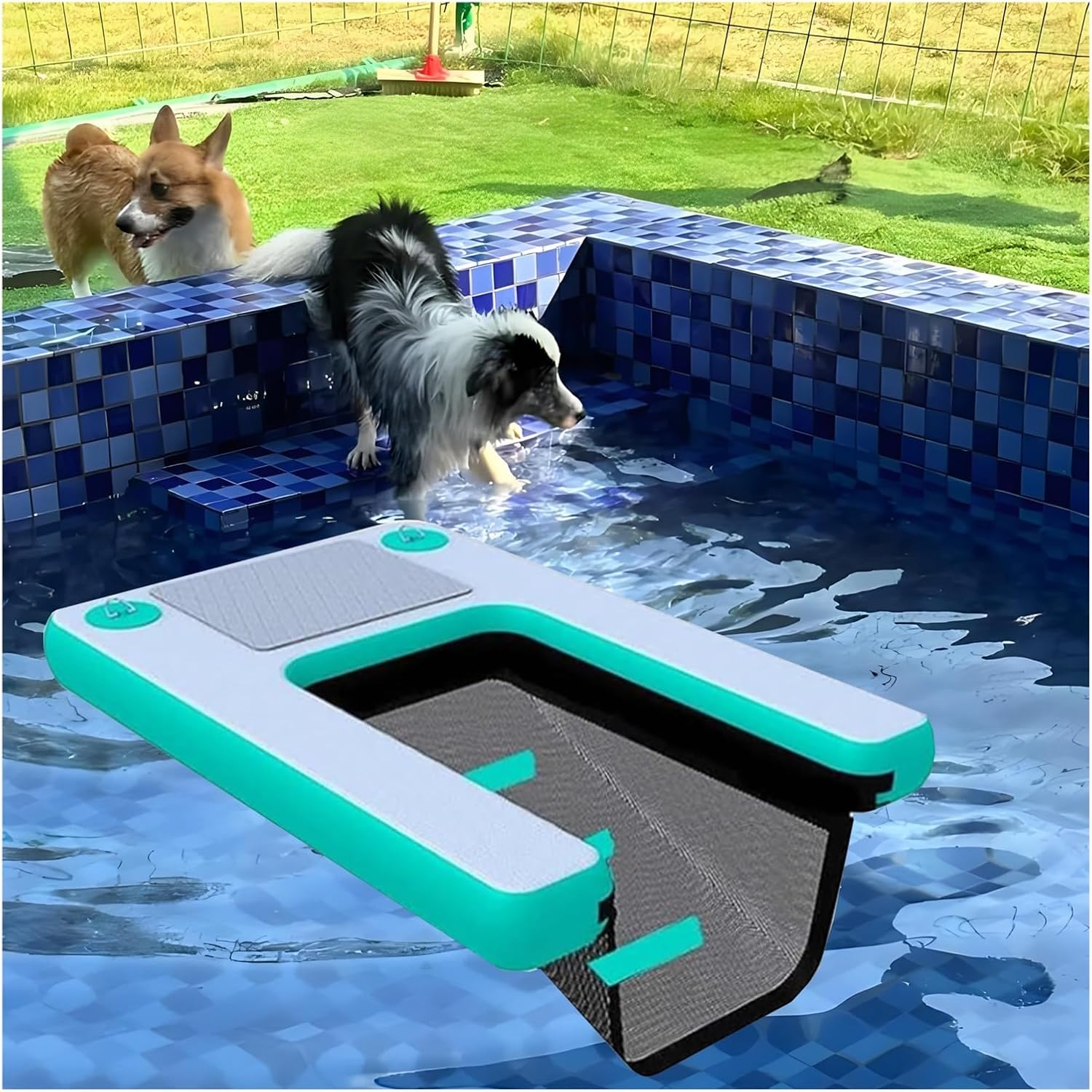 Still worried about your dog's difficulty in getting to shore after playing in the water in the summerWith MZZKFC inflatable dog ramp, these are not a matterThe love you give to your dog is hidden in these small details. Whether you are traveling or going to a friend's pool party, easy to carry, happy to go! Every time your dog plays in the water will become a good memoryHurry up and prepare for your babySpecification :Product Name: Inflatable Dog Climbing LadderMaterial: PVCSize: 59.1x39.4x3.9 in (Customizable)Color: Green/ Blue/ Yellow/ Red/ BlackWeight: 17.6 lbsLoad Capacity: 231 lbsFoldable or Not: YesAccessories: Pump/ Storage Bag/ String/ Repair KitFeatures:1. PVC material dog pool ramp, can withstand frequent use and paw scratching, long service life2. The dog float is equipped with EVA anti-skid pads to prevent slipping and falling and protect your dog from climbing3. Underwater weighted net, so that the dog water ramp is not easy to shake, shift or fall over in the water, so that your dog can climb more stable4. Curved corners to prevent your dog from getting hurt5. The inflatable dog ramp can be inflated and deflated quickly, and the compact size after storage makes it easy to carry around6. No need for complicated tools and professional skills, follow the instructions to easily complete the floating dock inflatable installation, can be quickly put into use7. The Dog Floating Ladder is suitable for swimming pools, lakes, rivers and other water environments, to meet the needs of dogs in various scenarios in and out of the water8. The surface of the dog boat ramp is smooth, easy to clean, stains, water stains, daily simple wipe to keep clean, low maintenance costsPackage Includes :1 x Dog Water Ramp